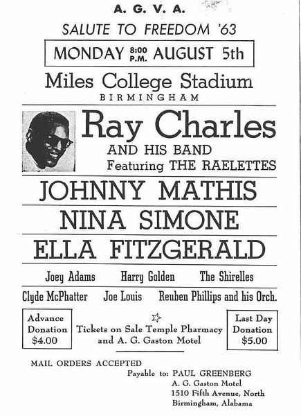 Taxi drivers refused to transport the show's cast and personnel. Rev. King collected a caravan of 50 private-car volunteers. Hotels had refused lodgings; Adams got a motel, run by A. G. Gaston, former Negro undertaker and now owner of the motel, the local Negro bank and Negro insurance company to provide lodgings. ~Leo Shull in “Show Business”