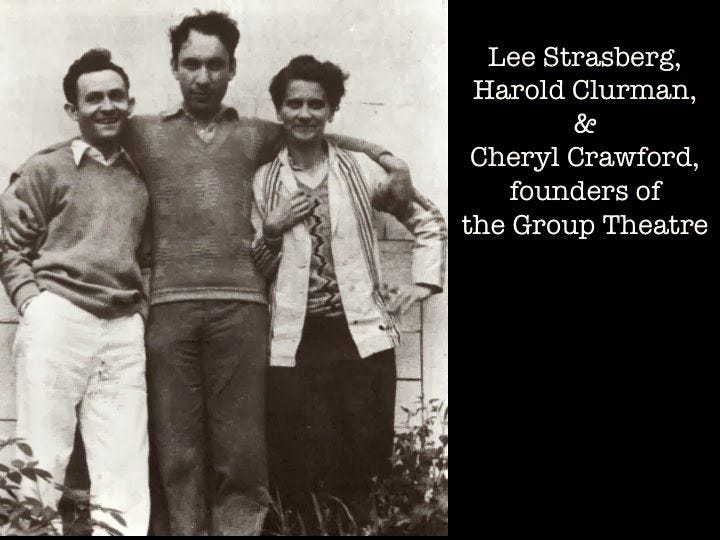 Influenced by the American Lab three Americans founded The Group Theater in New York, 1931. The founders were Producer Cheryl Crawford, Actor and Director Lee Strasberg, along with Director and Critic Harold Clurman. Strasberg and Clurman taught and directed in search of a distinctly American version of Stanislavsky’s system. The were also left-leaning politically and involved, through theater, in social action.