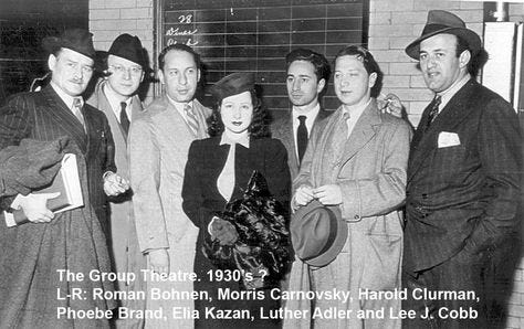 The original Group Theater company included Stella Adler, Luther Adler, Elia Kazan, John Garfield, Sanford Meisner, Sidney Lumet, Lee J. Cobb, Morris Carnofsky and many other distinguished actors. Principal among the playwrights was Clifford Odets.